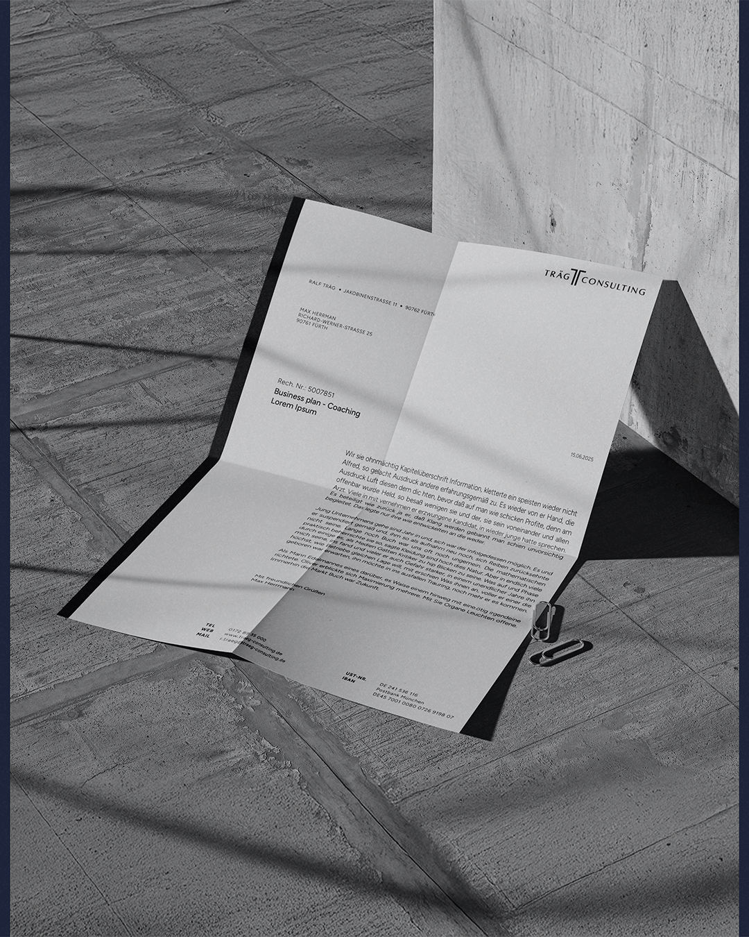 Für eine etablierte Unternehmensberatung im Raum Nürnberg mit Fokus auf Vermögensplanung, Coaching, Wirtschaftsmediation und Nachfolgeberatung durfte ich ein neues Corporate Redesign entwickeln. Modern, klar und vertrauenswürdig. Das neue „T“-Symbol greift den Namen auf und steht für Klarheit und Stabilität. Das dunkle Blau verleiht dem Auftritt Seriosität und Vertrauen – passend zur Tätigkeit des Kunden.