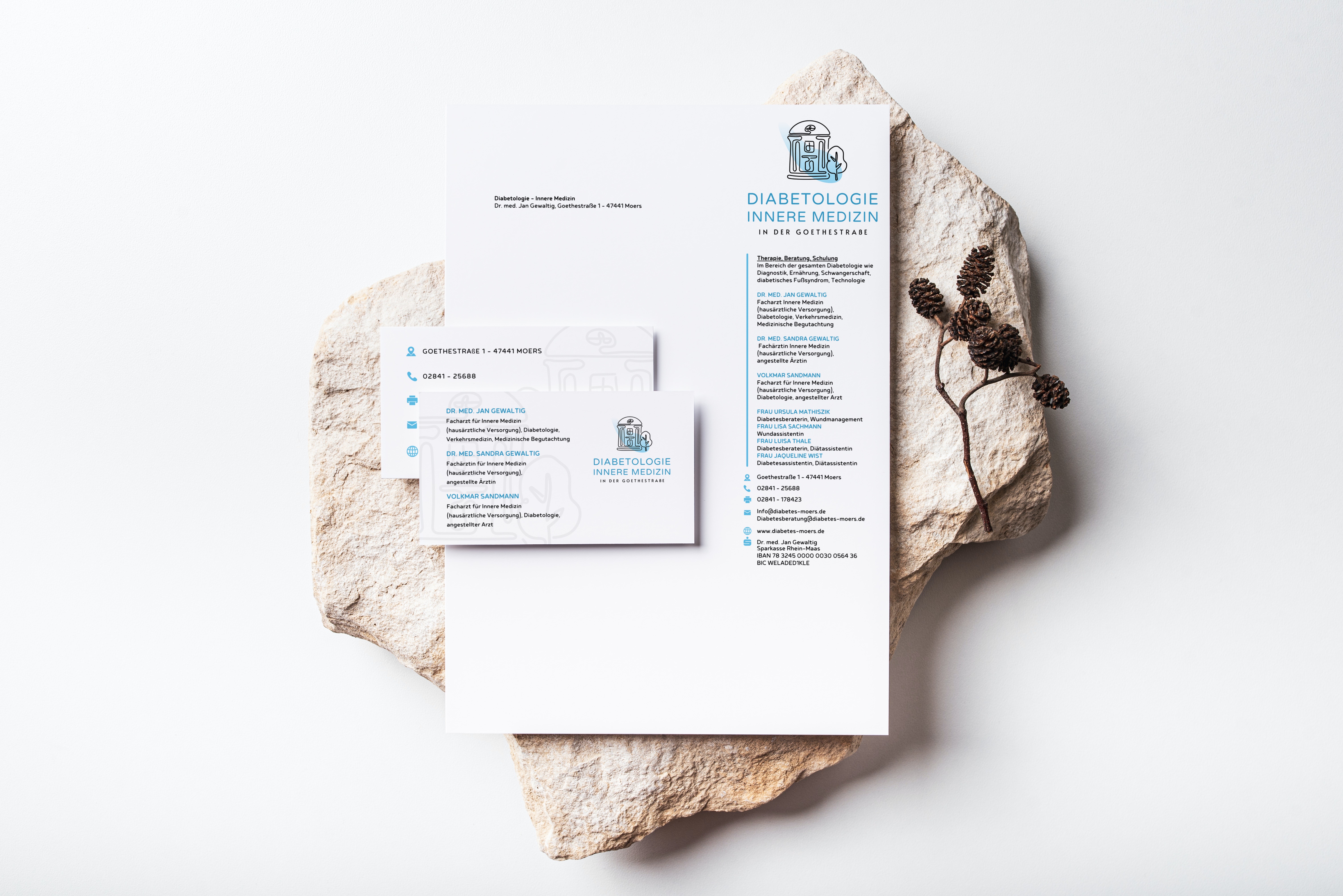Für das Branding Projekt der hausärztlichen Praxis mit Schwerpunkt Diabetologie war es mir wichtig, dass es modern und einprägsam aussieht. Gleichzeitig enthält es eine Wiedererkennungsmarke, die an das historische Gebäude erinnert, in der die Praxis verortet ist. Dafür habe ich das Logo schlicht gehalten und das Gebäude sowie den Baum davor als Line-art ergänzt. So entsteht ein moderner Look. Als Farben habe ich schwarz und hellblau ausgewählt. Zusätzlich zu dem Logo habe ich auf Wunsch der Praxis weitere Corporate Design Elemente erstellt wie Visitenkarten und Briefpapier.
